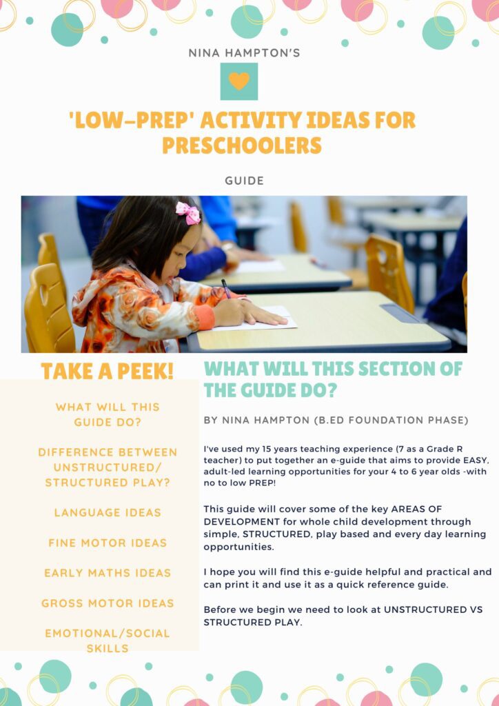 Nina Hampton (B.ED Foundation Phase), has used her 15years teaching experience to put together a e-guide’s and courses that aim to provide EASY adult-led learning opportunities for your children, with no to low prep.